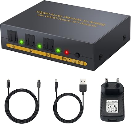 Esynic 3×1 Convertitore Audio Ottico Con Uscita Stereo Rca L R Jack 3 5mm E Alimentatore Eu Converter Adattatore Dac Decoder Supporta Dolby Dts 5 1 Splitter Switch Optical Toslink Per Sky Ps4 E Cuffie